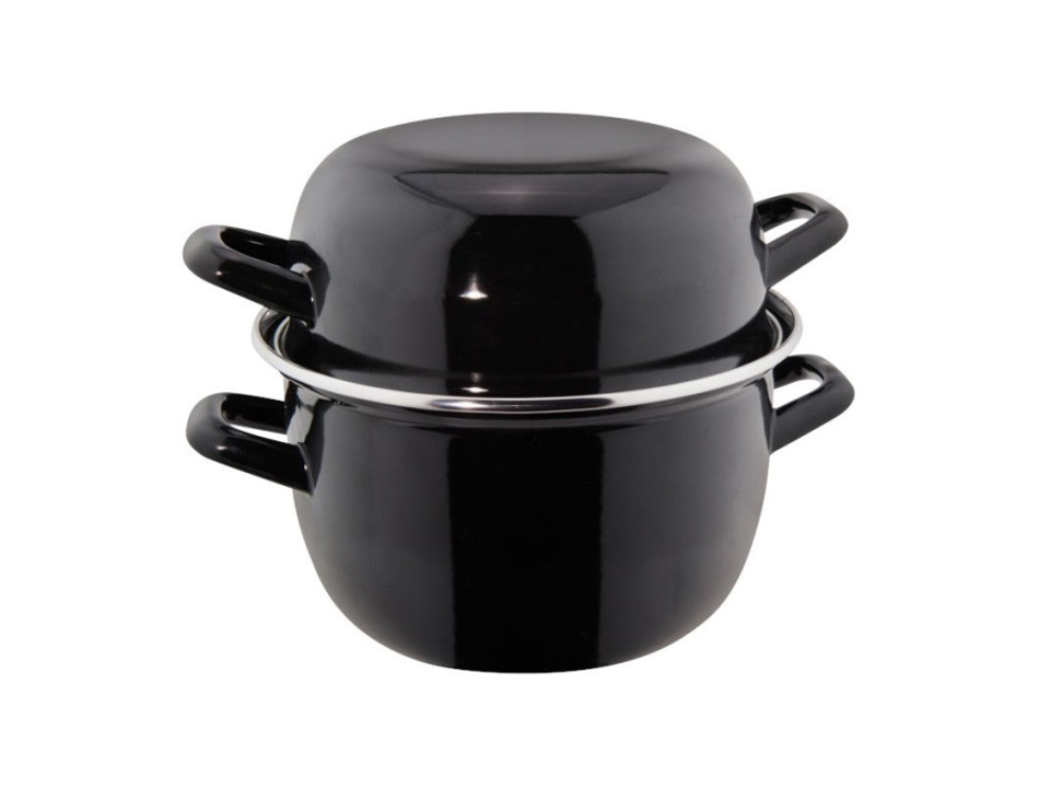 Cocotte per molluschi con coperchio dal diametro di 24 cm, altezza di 14 cm e capacità di 5,2 litri.