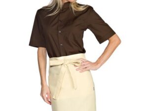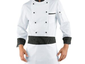 Giacca cuoco con tessuto elasticizzato per il massimo del confort, profili a contrasto collo alla coreana e chiusura con clips.